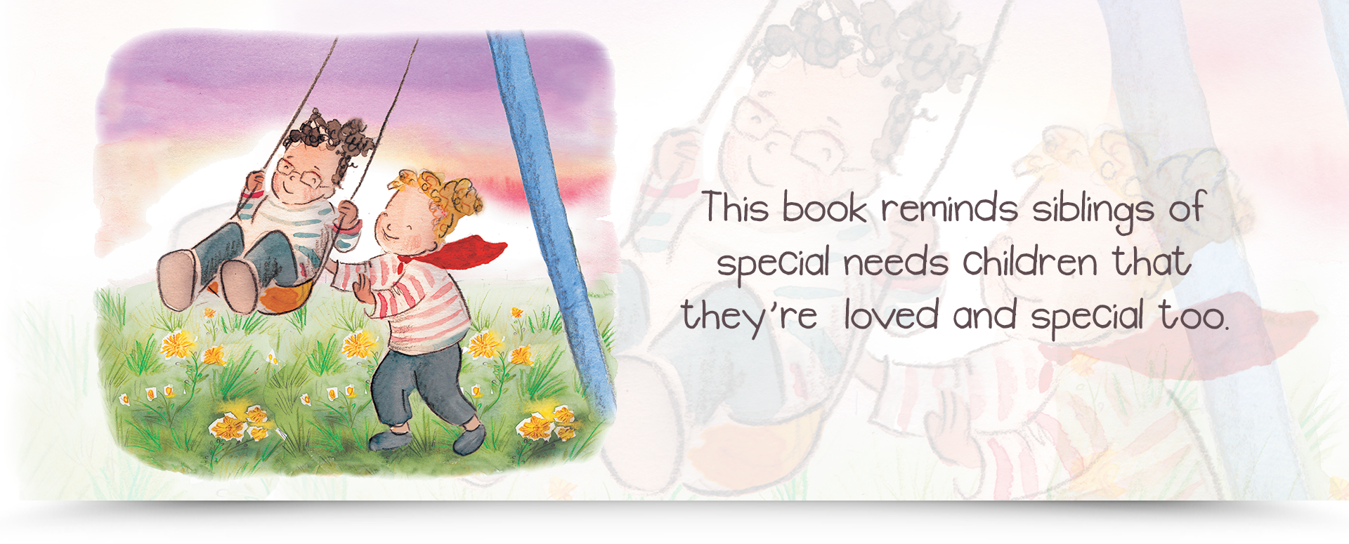 You Are a Superhero, Too! is written in a parent’s voice, and affirms the unique role a neuro-typical child (the main character) plays in the family, when living alongside a sibling with special needs. The book acknowledges the tender dynamics within their world and encourages the child in a way that says, “Your parents see you, love you, are proud of you, and know this road you walk is not easy,” a message these children need and long to hear.